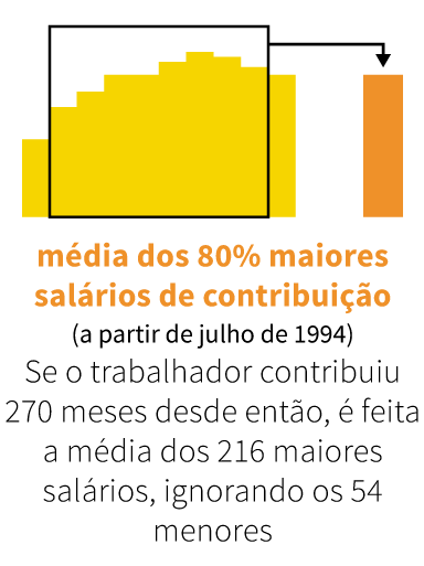 Pelas regras atuais, a média dos salários de contribuição considera as 80% maiores remunerações do trabalhador a partir de julho de 1994. Ou seja, se ele contribuiu por 200 meses de lá para cá, somente os 160 maiores salários entram na conta. Isso favorece o segurado, pois a média não é “contaminada” pelas menores remunerações.