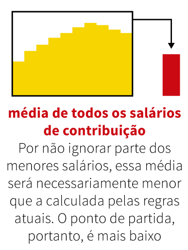 A nova fórmula, por sua vez, leva em conta todo o histórico de salários, incluindo aqueles mais baixos, típicos do início da carreira. Com isso, a média salarial será necessariamente mais baixa.