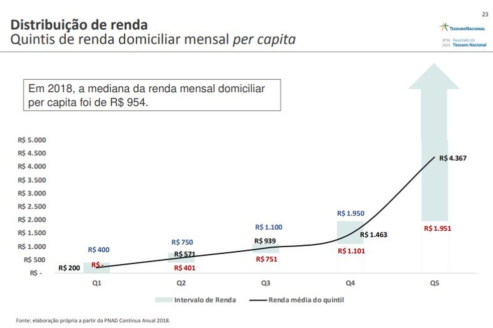 O secretário explicou que o gráfico divide a população brasileira em cinco partes de acordo com a a renda mensal: a primeira (Q1 no gráfico) reúne os 20% mais pobres; a segunda (Q2) entre os 20% e 40% mais pobres; até a última (Q5), que representa os 20% mais ricos, com renda mensal superior a R$ 1.951 naquele ano.