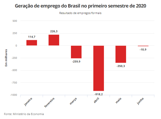 Considerando exclusivamente o mês de junho, foram fechadas 10,9 mil vagas de emprego formal. Em maio, haviam sido 350 mil. Em abril, pior mês do ano até aqui, foram fechadas 918 mil vagas.