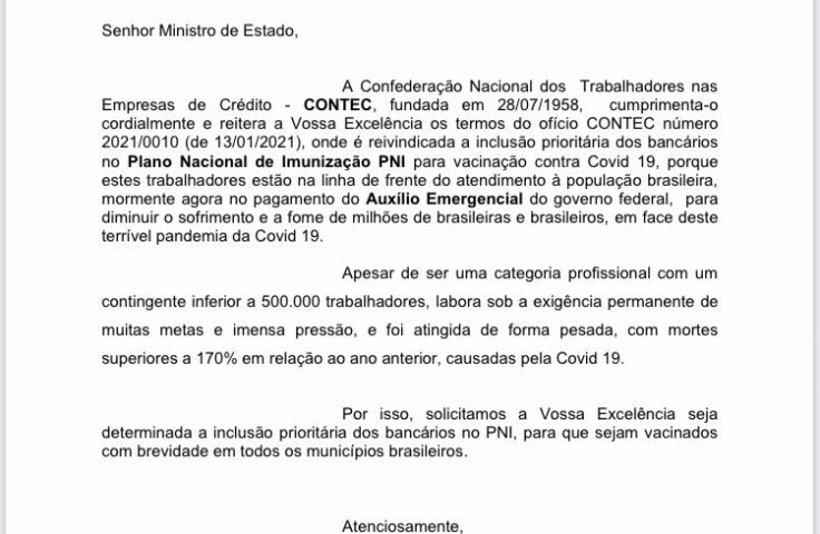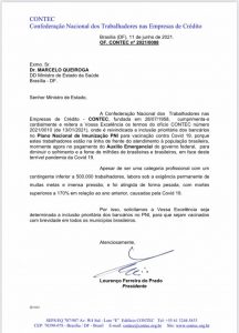 18 de junho de 2021CONTEC encaminhou novo ofício, ontem (16), ao ministro da Saúde, Marcelo Queiroga. No documento, a entidade reitera a reivindicação pela inclusão prioritária dos bancários no Plano Nacional de Imunização (PNI) para vacinação contra a covid-19.