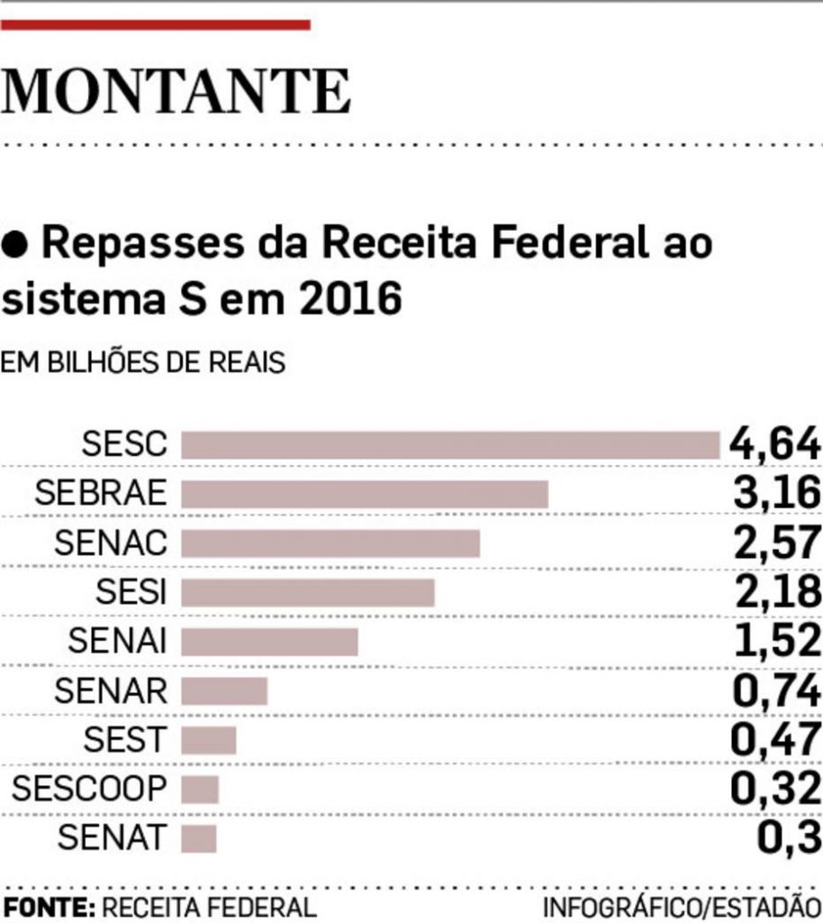 Trata-se do conjunto de serviços administrados pelos organismos oficiais dos empresários cujas iniciais começam com S: Sesi, Senai, Sesc, Senar, Senac, Sest, Senat, Sebrae, Sescoop. É um bolão de recursos 4,5 vezes maior do que o do imposto sindical. Em 2016, os sindicatos patronais e dos trabalhadores receberam R$ 3,6 bilhões, enquanto só o Sistema S ficou com R$ 16 bilhões – excluindo-se a contribuição colhida paralelamente pelo Sesi e o Senai.