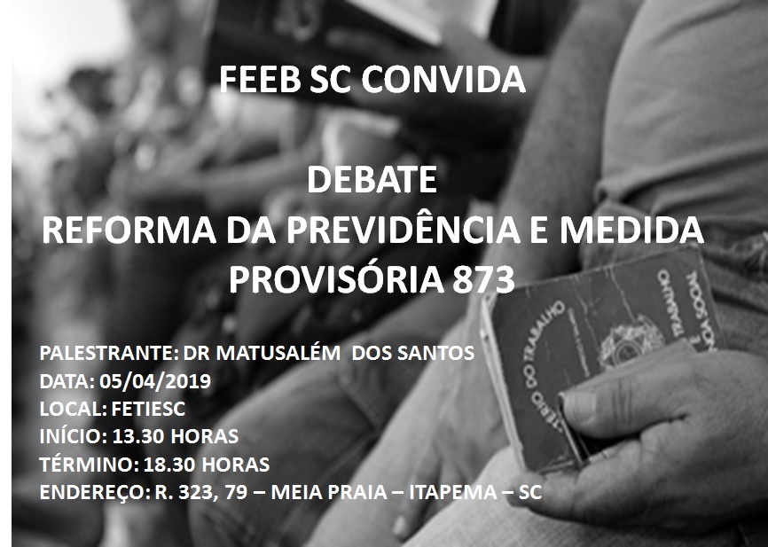 A Federação dos Empregados em Estabelecimentos Bancários no Estado de Santa Catarina convida para o Encontro que debaterá a Reforma da Previdência e a Medida Provisória 873. Serão convidados os Deputados Federais e Senadores de Santa Catarina.
