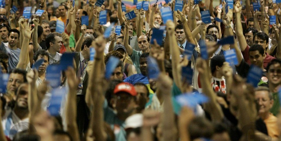 Bancarios realizam assembleia para definir os rumos da greve por tempo indeterminado, decretada na noite de ontem, em Brasilia, DF, dia 08 de outubro de 2008. As reivindicaes incluem um aumento real de 5% nos salrios, valorizao dos pisos salariais, aumento do valor e simplificao da distribuio da participao nos lucros, vale-refeio de R$ 17,50, cesta-alimentao de R$ 415, contratao de funcionrios - sobretudo caixas -, diminuio das tarifas bancrias e ampliao da licena maternidade e paternidade. (Nelson Antoine/FOTOARENA)