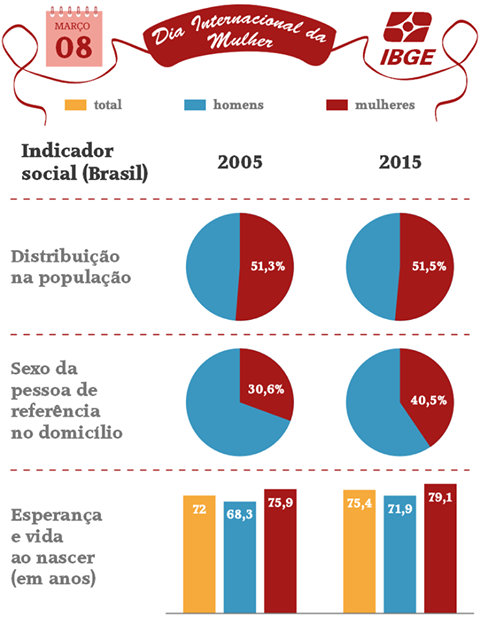 A proporção de mulheres no Brasil foi de 51,3% em 2005 para 51,5% em 2015. Dessa forma, no país a razão de sexo foi de 94,3 homens para cada 100 mulheres em 2015, sendo que pelas estimativas de população das Nações Unidas a razão de sexo do mundo foi de 101,8 homens por 100,0 mulheres; ou seja, diferentemente do Brasil, na população mundial havia mais homens que mulheres.