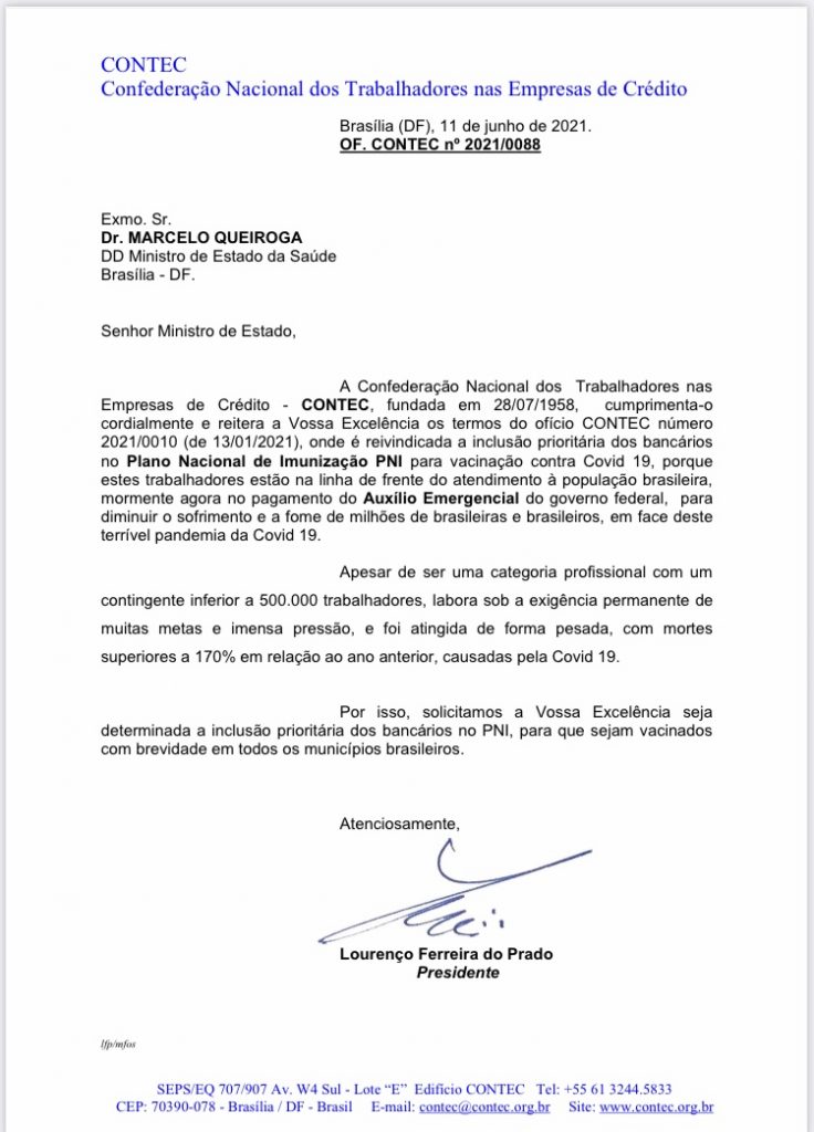 CONTEC reforça pedido ao Governo para vacinar trabalhadores em bancos