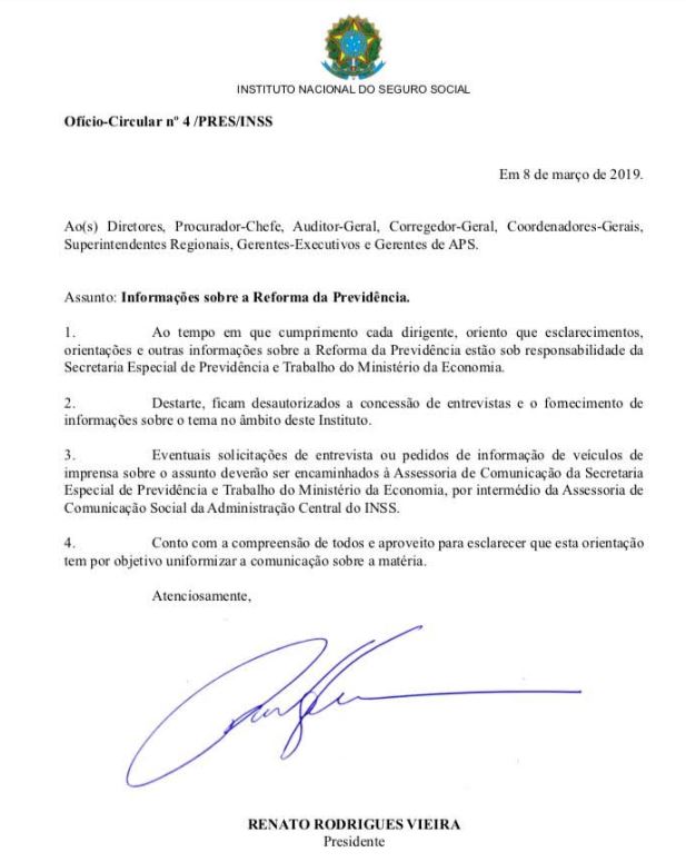Mais uma decisão controversa tomada por este governo. O presidente do Instituto Nacional do Seguro Social (INSS), Renato Rodrigues Vieira, por meio de ofício-circular impõe uma espécie de “lei do silêncio”, em torno da reforma da Previdência (PEC 6/19), na autarquia.