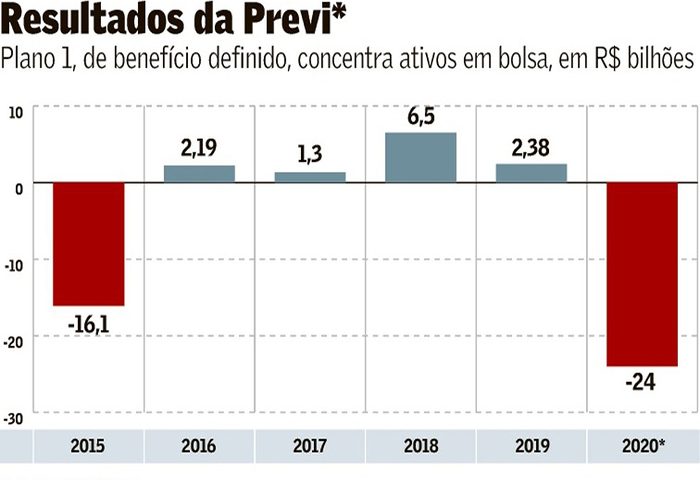 A crise nos mercados causada pelo avanço do coronavírus levou a Previ, fundo de pensão dos funcionários do Banco do Brasil, a um déficit de R$ 24 bilhões no primeiro trimestre do ano. O resultado refere-se ao Plano 1, de benefício definido (BD), que concentra a maior parte dos investimentos em bolsa. Com o resultado positivo da bolsa em abril, houve recuperação de R$ 2 bilhões, segundo dado prévio.