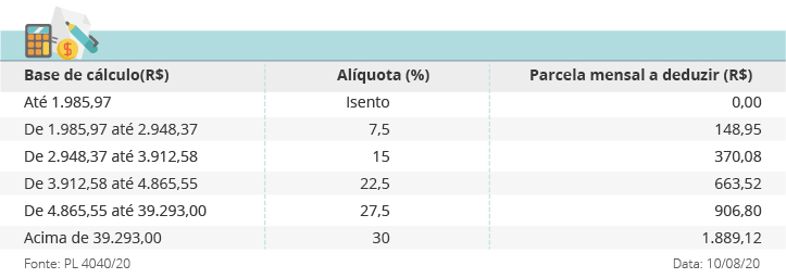 O Projeto de Lei 4040/20 atualiza os valores da tabela do Imposto de Renda da pessoa Física (IRPF) pela inflação do ano passado e cria uma alíquota de 30% para os salários mensais acima de R$ 39.293,00. Este valor é o teto atual do funcionalismo público. Atualmente, a maior alíquota é de 27,5%, que recai sobre salários mensais acima de R$ 4.664,68.