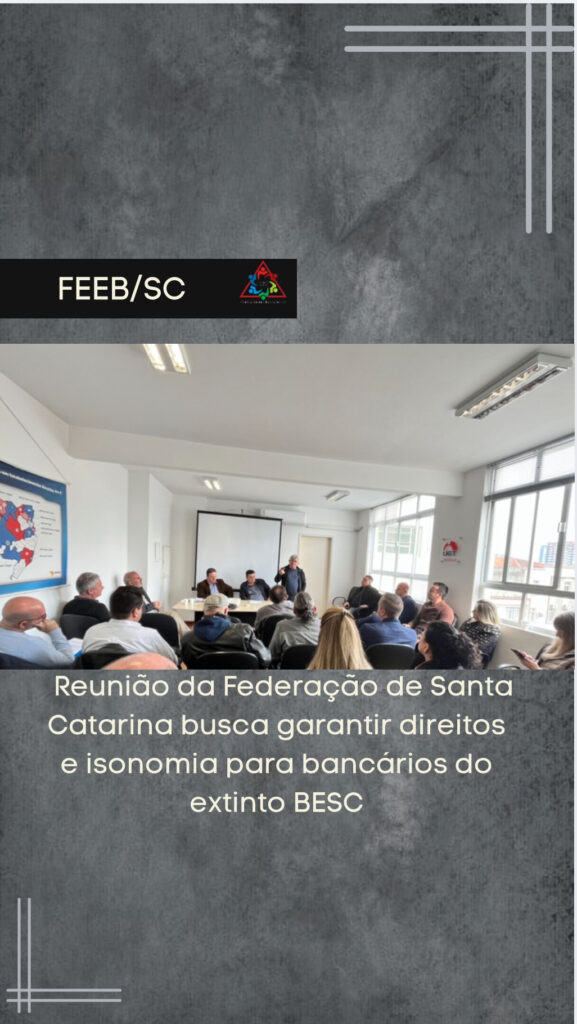 14 de julho de 2025Na última quinta-feira (10), a Federação dos Bancários de Santa Catarina (FEEB-SC) realizou uma reunião extraordinária que teve como uma das pautas, temas relacionados ao Banco do Brasil, especialmente nas demandas específicas dos funcionários que ingressaram na instituição após a incorporação do extinto Banco do Estado de Santa Catarina (BESC).