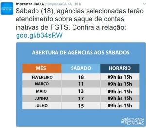 16 de fevereiro de 2017Conforme divulgado no Twitter @ImprensaCaixa, abaixo está o calendário com os horários que a Caixa Econômica Federal terá atendimento especial no sábado para atendimento dos saques das contas inativas FGTS. Confira abaixo: