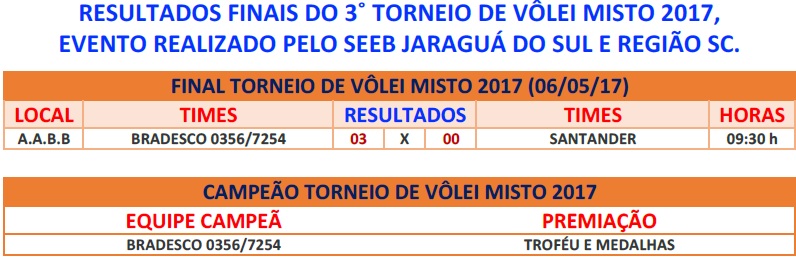 RESULTADOS FINAIS DO 3˚ TORNEIO DE VÔLEI MISTO 2017, EVENTO REALIZADO PELO SEEB JARAGUÁ DO SUL E REGIÃO SC.