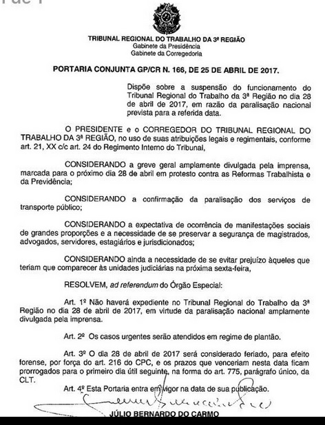 O surto grevista ocorre à revelia do Tribunal Superior do Trabalho (TST). Líderes de partidos governistas supreenderam-se com a novidade. Legendas que dão suporte legislativo à gestão Temer cogitam protocolar representação no Conselho Nacional de Justiça contra os responsáveis pela paralisação. Veja abaixo reprodução da cópia da portaria editada pelo TRT de Minas Gerais sobre a greve.
